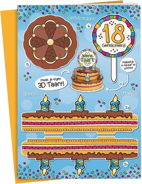 - 3D Wenstaart 18 Jaar - Wordt geleverd als XL kaart met grote gele envelop - Materiaal: Karton - Afmetingen: De kaart zelf is 49cm hoog en 35cm breed, in elkaar gezet is de taart 24cm hoog en heeft een diameter van 22cm. - Een leuke taart om kado te geven met een verjaardag! Zet hem voor de jarige in elkaar of stuur hem gewoon per post op! (De kaart past niet door de brievenbus dus wordt in een pakket bezorgd)