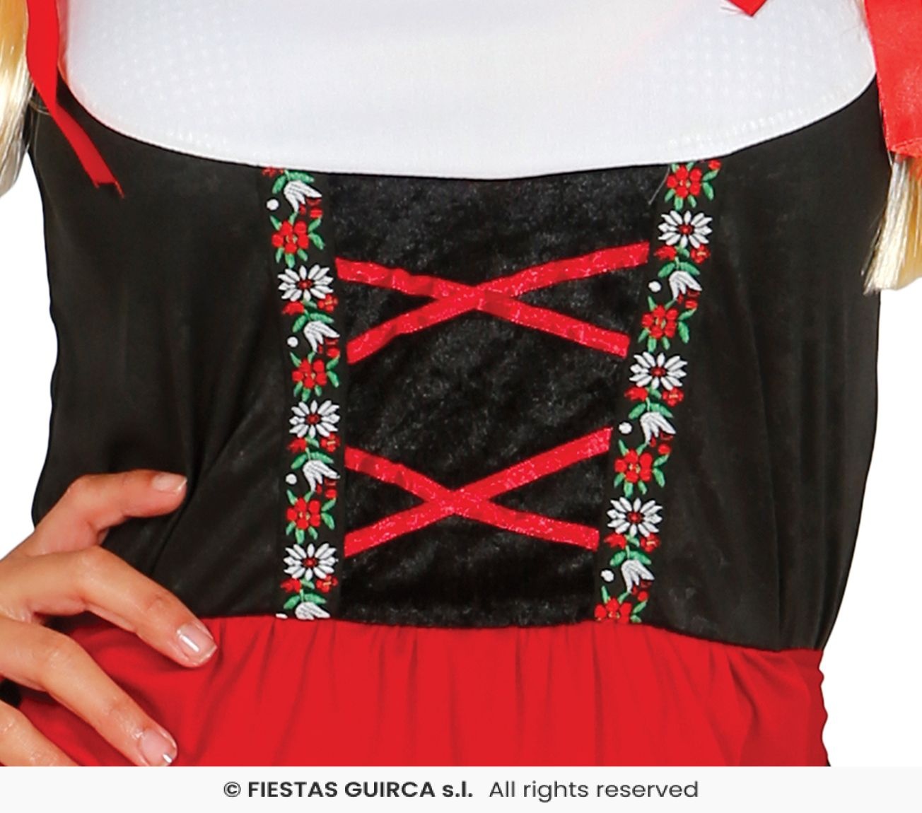 - Leuke jurk met rode schort, rode lintjes en een wit gegolfde halslijn en mouwen.