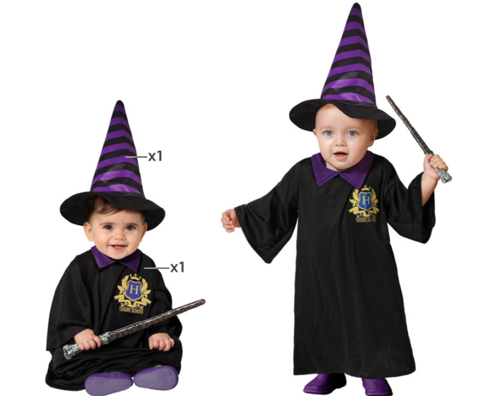 - Baby Wizard Tovenaarspakje Harry zwart/paars- Bestaande uit: Tuniek en Hoedje- Beschikbare maten: 6-12, 12-24 en 24-36 maanden
