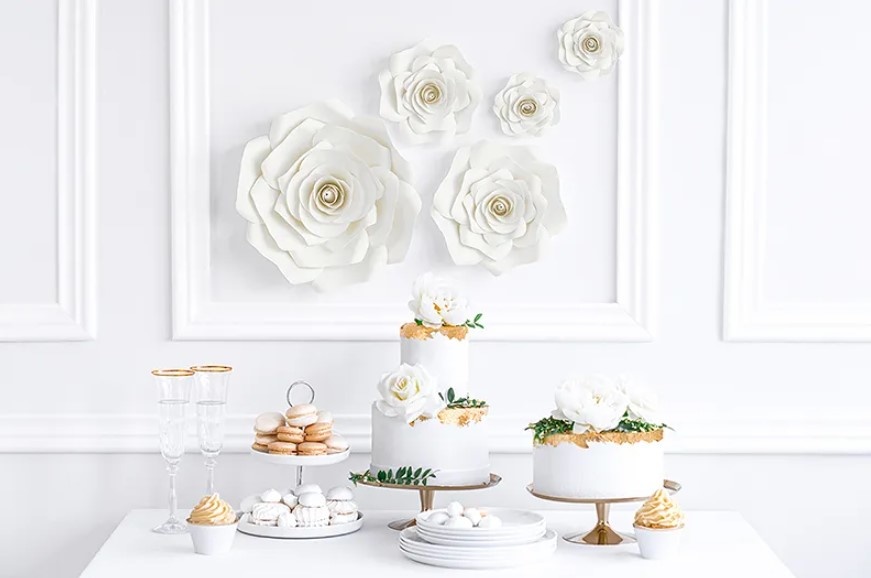- Backdrop ‘Bloemen mix’ Light Cream- 5 stuks in verpakking- Diameter: 30, 20, 15, 10 en 10 cmDeze papieren bloemen zijn een schitterende backdrop voor bij jouw feest! Hang ze achter de taartentafel of bij de photobooth.