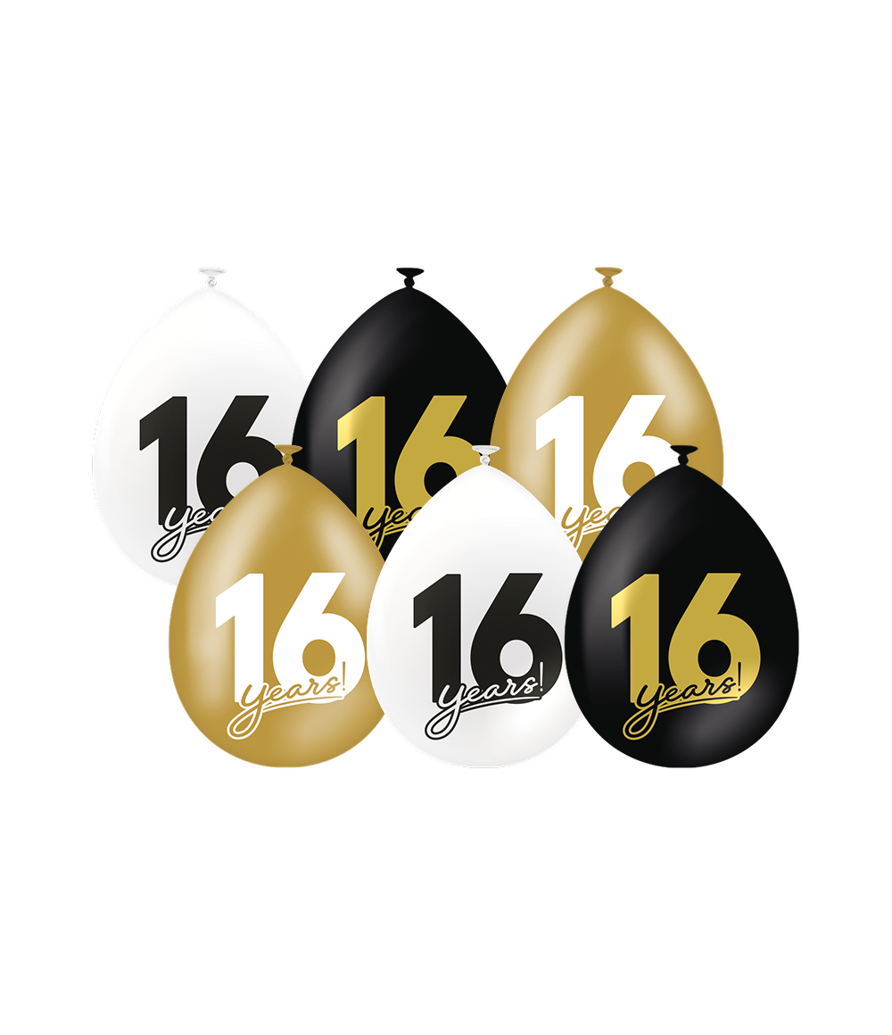 - Ballonnen Celebration 16 Jaar Wit/Goud/Zwart (6st) - Aantal: 6 stuks per verpakking - Diameter: 30 cm - Inhoud: Leeg (standaard) - Geschikt voor: Lucht (bij gebruik van helium staan de cijfers en figuren ondersteboven) - Materiaal: Latex
