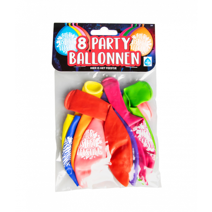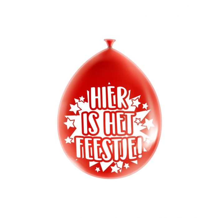 - Ballonnen 'Hier is het feestje'- Aantal: 8 stuks per verpakking- Diameter: ± 30 cm- Inhoud: Leeg (standaard)- Geschikt voor: Lucht (bij gebruik van helium staan de letters ondersteboven)- Materiaal: Latex