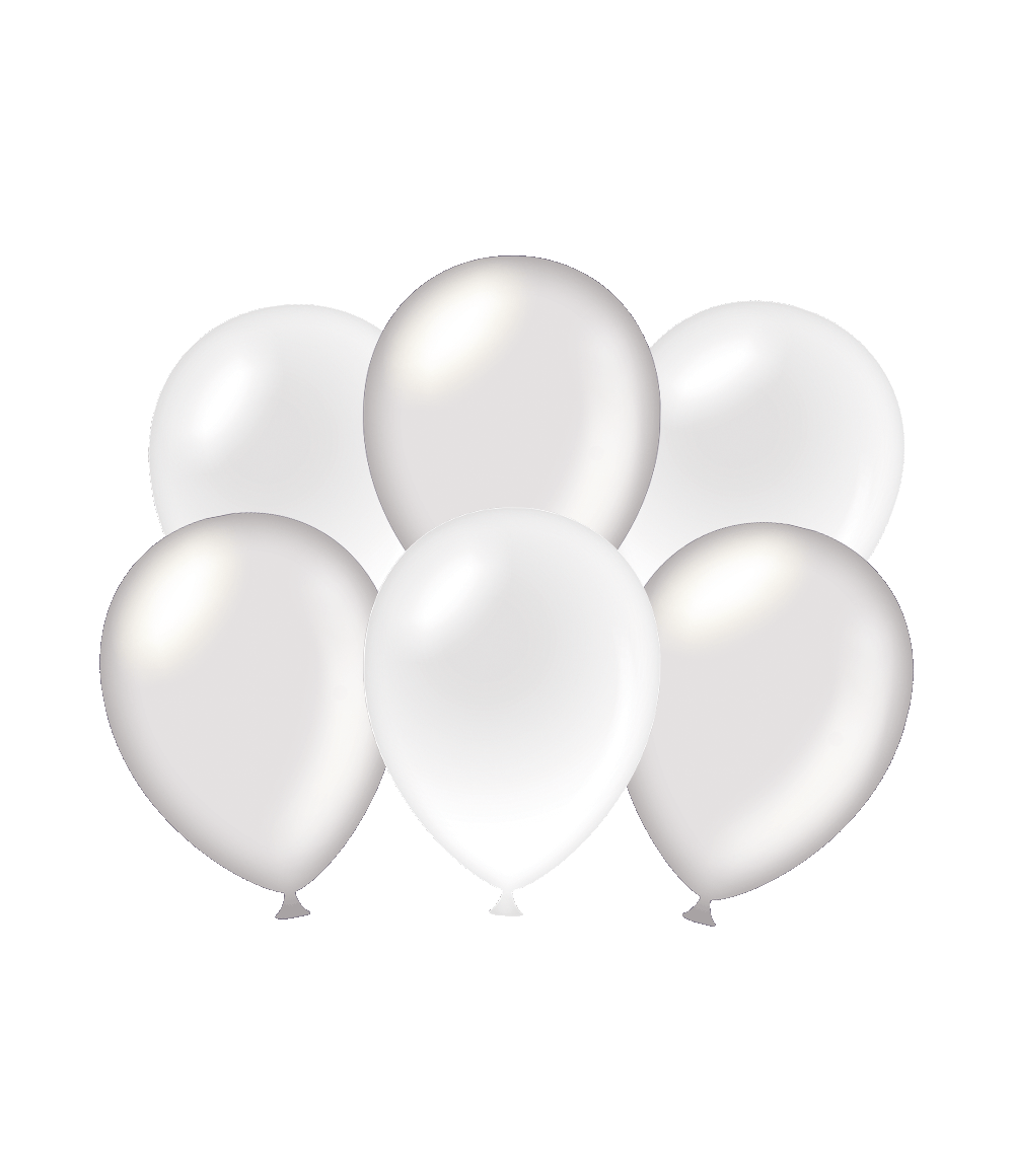 - Ballonnen Metallic Zilver/Wit - Diameter: 30 cm - Bestaande uit: 6 stuks per verpakking - Materiaal: Latex - Geschikt voor: Helium en lucht - Zweeftijd (helium): 12-14 uur