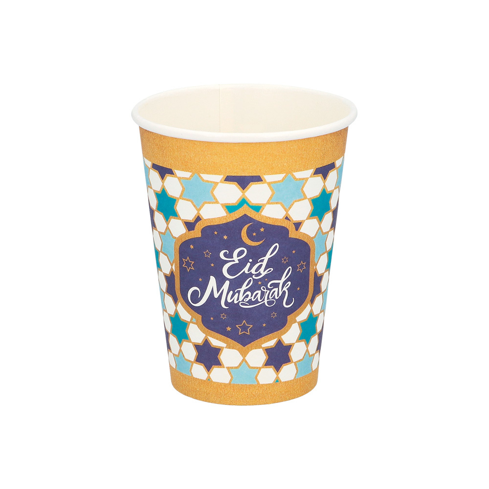 - Bekers Eid Mubarak Blauw/Goud- Bestaande uit: 8 bekers- Materiaal: Papier/karton- Inhoud beker: 25cl