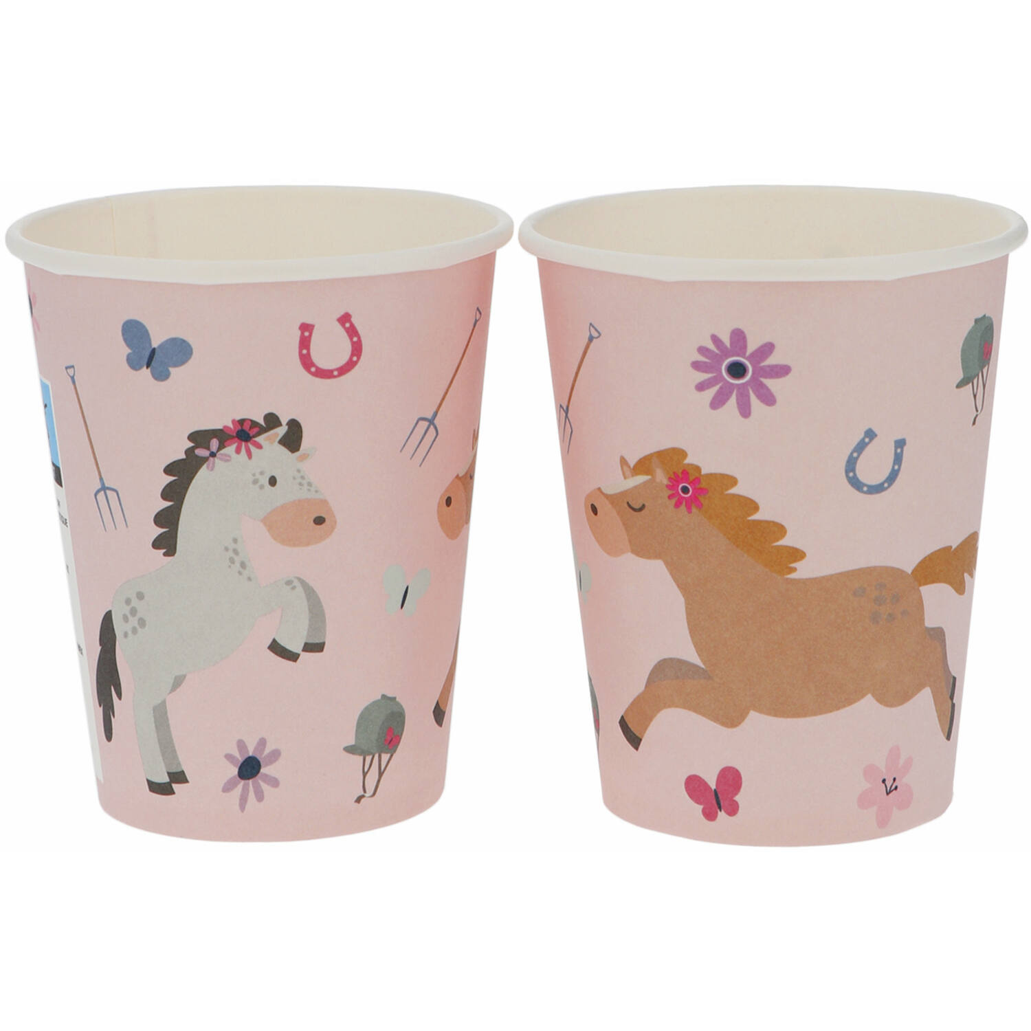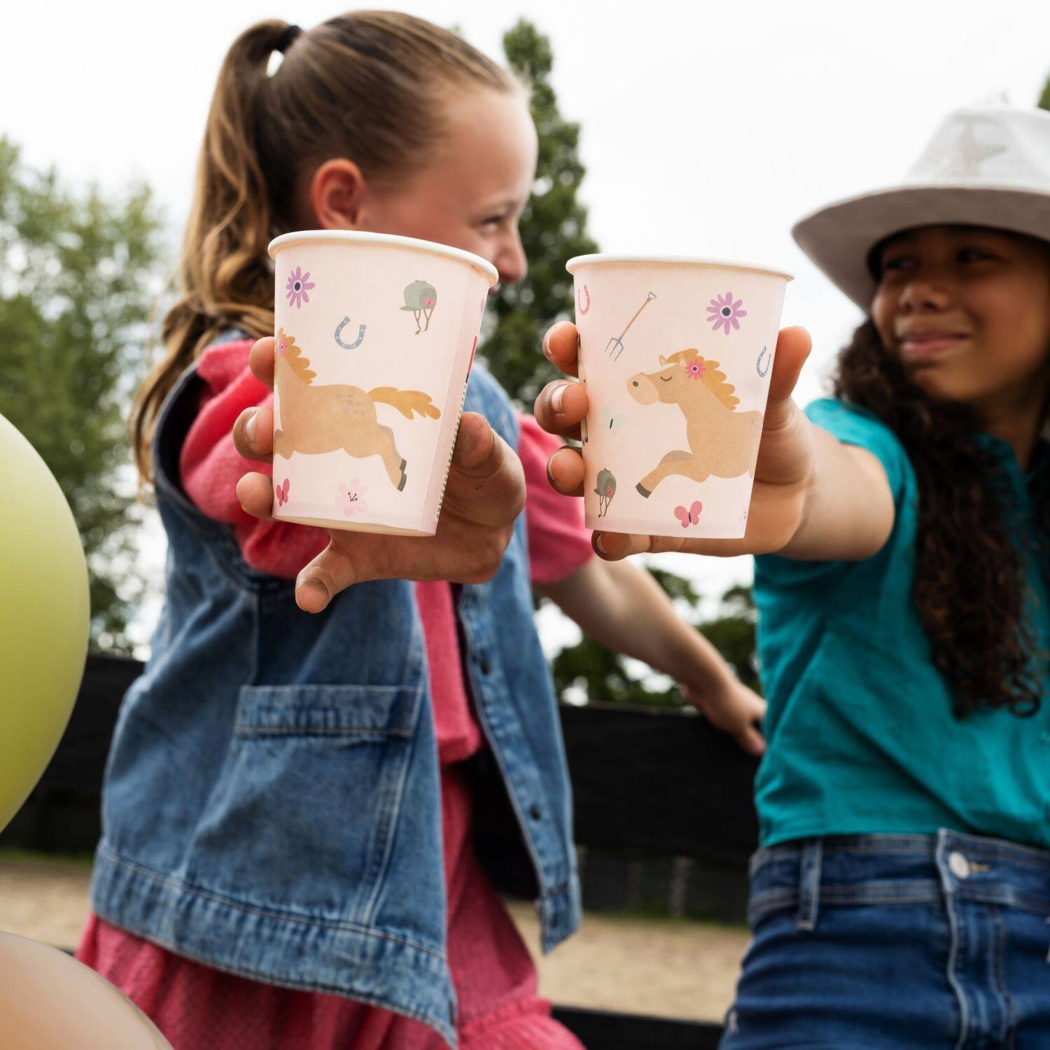 Deze paardjes drinken mee! Bekers - Happy Horses - 250 ml - 8 stuks. Inhoud: 8 papieren bekers. Bijvoorbeeld te gebruiken tijdens de volgende feestgelegenheid/feestgelegenheden: Kinderfeestje, Verjaardag, Themafeest. Leuke zachtroze papieren bekers met vrolijk dansende paardjes erop. Deze bekers horen bij de Happy Horses collectie van Folat. Dit artikel is gemaakt van papier.
