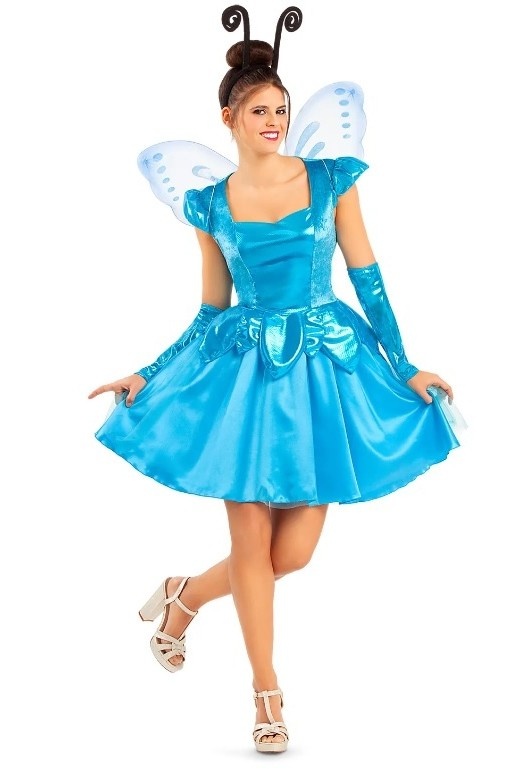 - Blauw Feeën Kostuum Vlinder- Bestaande uit: Jurk, Vleugels, diadeem en armstukken- Beschikbare maten: S, M/L en XL