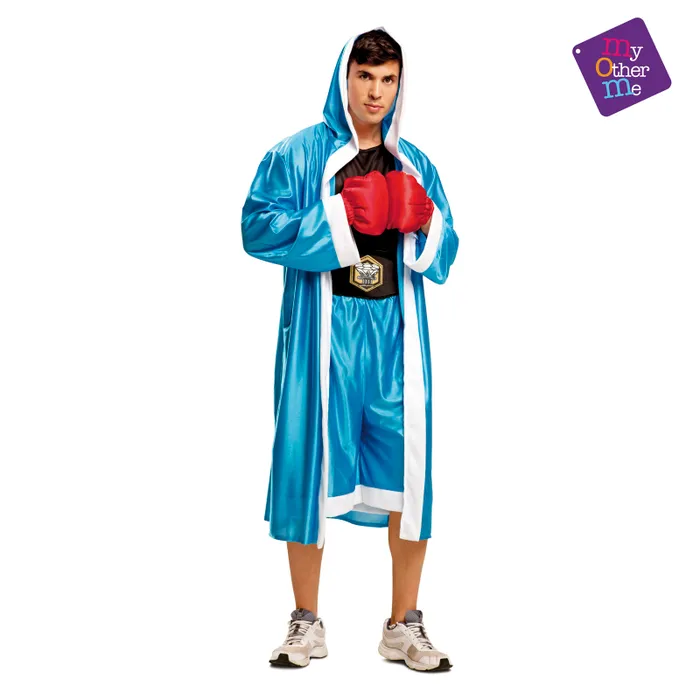 - Bokser Kostuum Wereldkampioen Blauw- Beschikbare maten: XL en XXL- Bestaande uit: Broek, shirt, jas met hoofdkap en handschoenen- Materiaal: Polyester