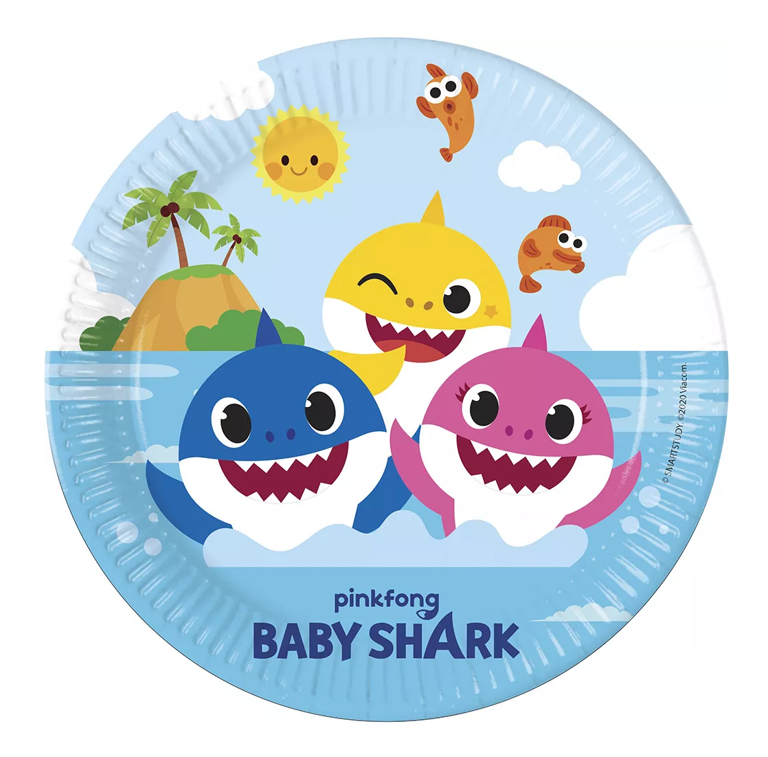 - Bordjes Baby Shark- Aantal: 8 stuks- Materiaal: Karton- Doorsnede: 23 cm