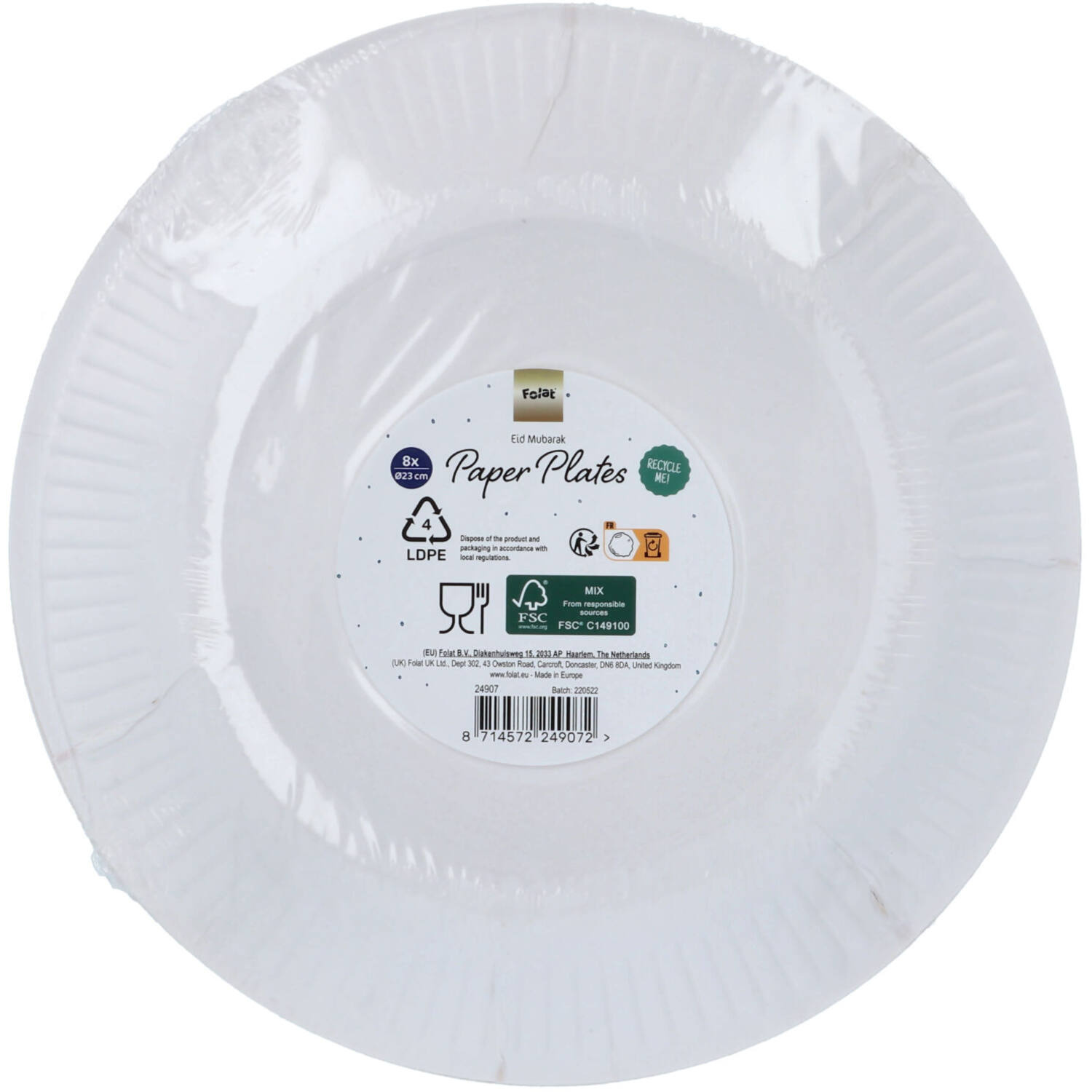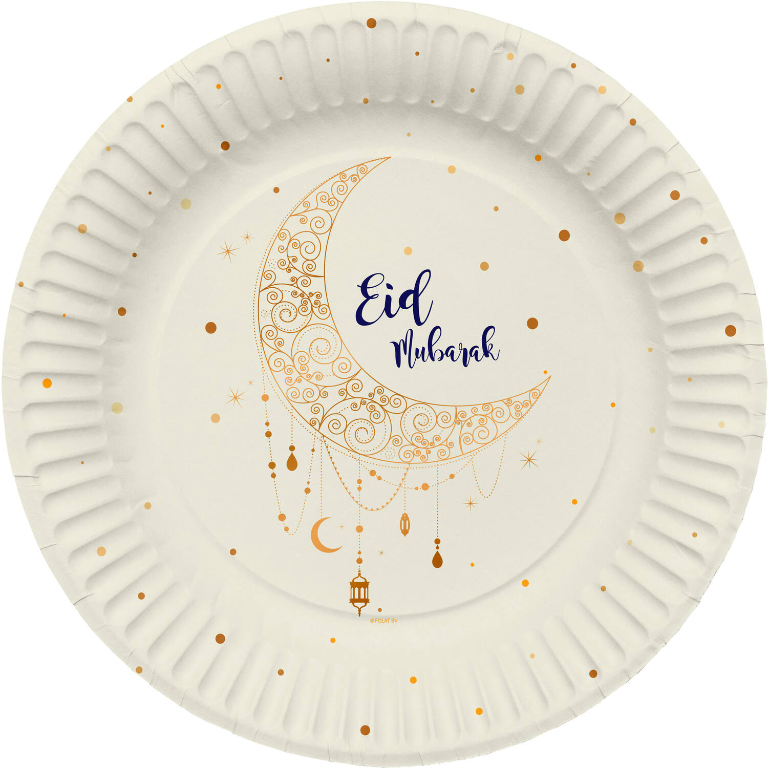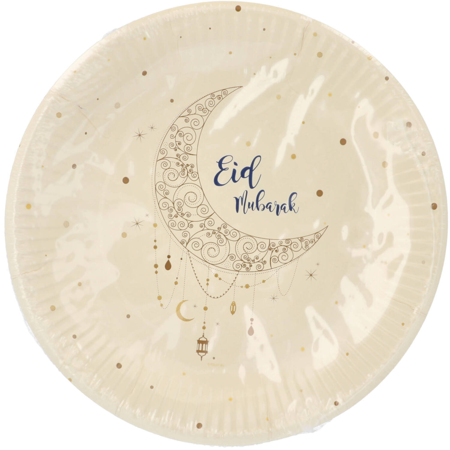 - Bordjes Ramadan Wit- 8 stuks in verpakking- Materialen: Papier- Afmetingen: Ø 23 cm- Bestaande uit: 8 Bedrukte bordjes Eid Mubarak Ramadan