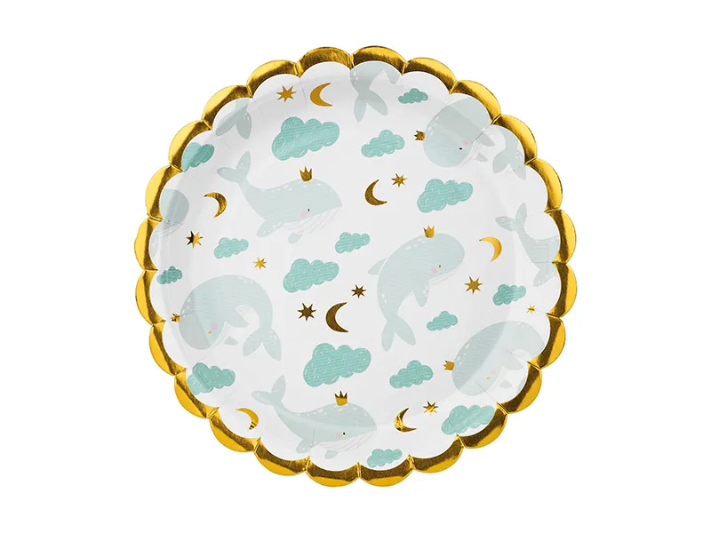 - Bordjes Walvissen Lichtblauw/Goud 18cm- Aantal: 6 stuks per verpakking- Diameter: 18cm- Materiaal: Karton