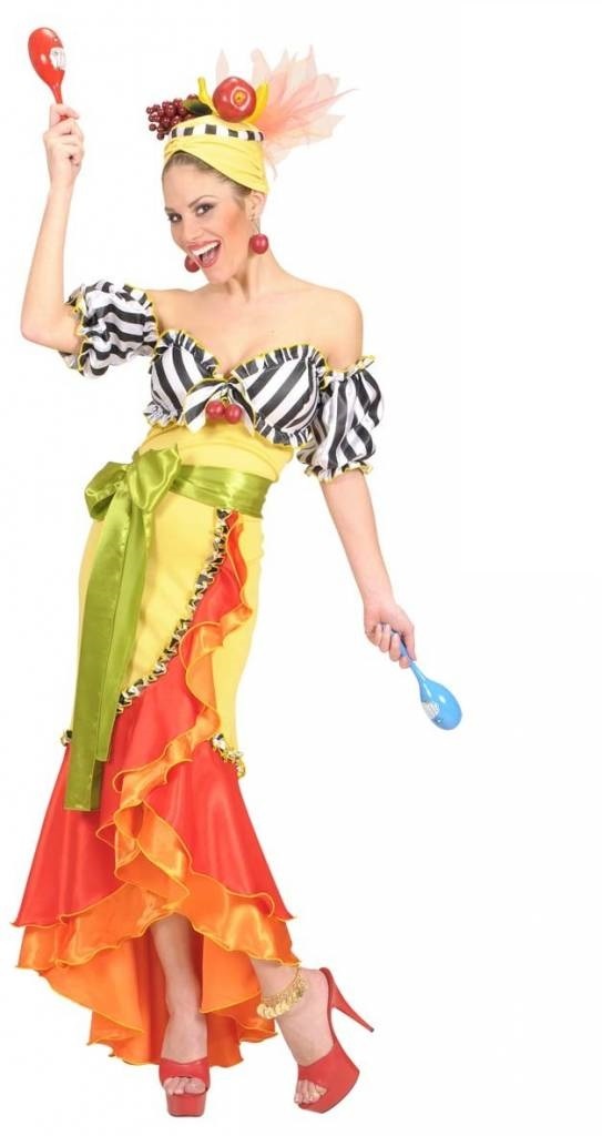 Een Braziliaanse party of ander themafeestje op het programma staan? Trek deze geweldige jurk aan en je zult de hele avond stralen! De jurk heeft een mooie kleurencombinatie en bestaat uit vele onderdelen. Maak de outfit compleet met een verentooi op het hoofd en een setje sambaballen!