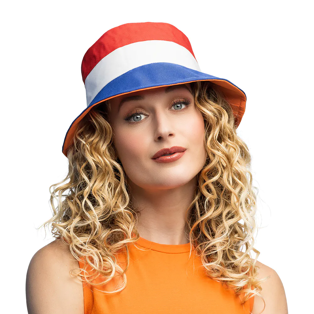 Vier in stijl met deze bucket hat in rood, wit, blauw! Met een comfortabele pasvorm van 59 cm laat je trots de Nederlandse kleuren zien tijdens Koningsdag, sportwedstrijden of festivals. De hoed is licht, stevig en beschermt tegen de zon. Een must-have accessoire voor echte Holland-fans.