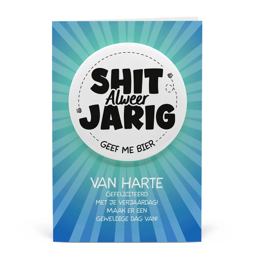 - Wens Kaart Shit Alweer Jarig - Afmetingen kaart: 17cm x 11cm- Afmetingen button: 9cm doorsnede- Bestaande uit: Wenskaart met button en enveloppe- Materiaal: Karton