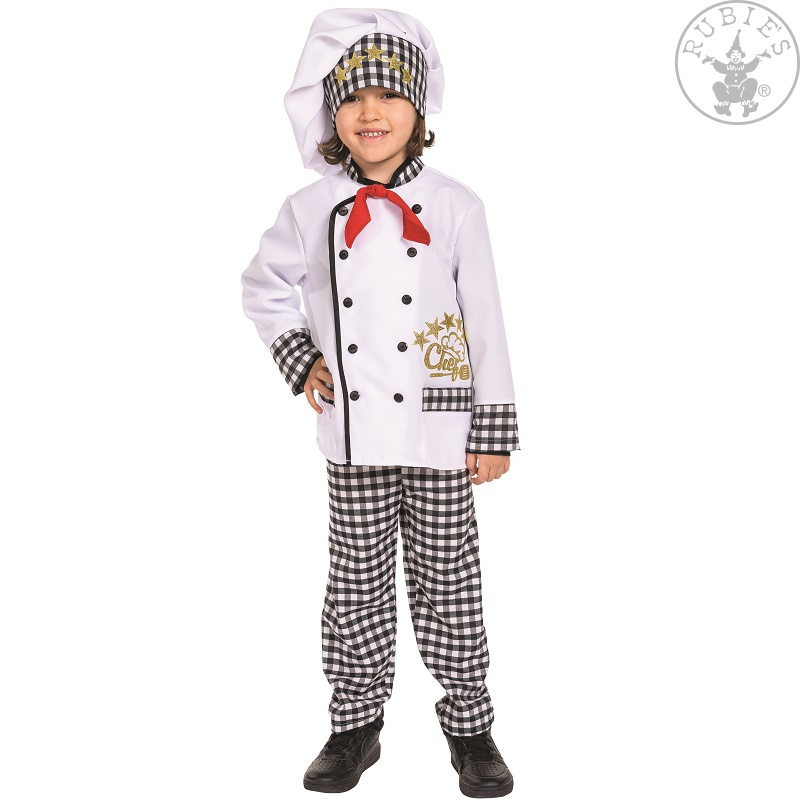 - Chef Kostuum Kind- Materiaal: Polyester- Beschikbare maten: 104, 116, 128 en 140- Bestaande uit: witte koksbuis met dubbele knopenrij en een aangehechte sjaal zwart-wit geruite broek en een koksmuts.