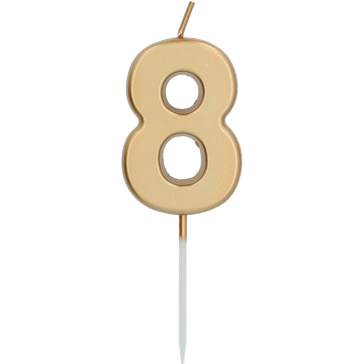 - Cijferkaars '8' GoudkleurigDeze kaars is ongeveer 5 cm groot. Inclusief prikker is de kaars ongeveer 8 cm. Het artikel is gemaakt van wax.