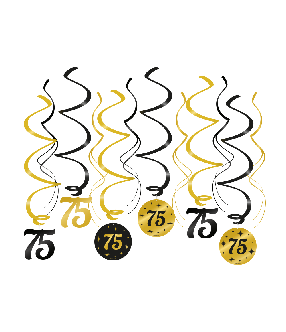 - Classy Party Swirls 75 Jaar- Aantal: 12 stuks per verpakking- Materiaal: plastic en stevig papier- Afmeting: ±70cm lang, diameter ±14cm