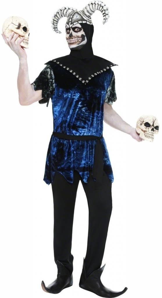 -Corrupt Narren kostuum bestaande uit: Tuniek, Riem, Kraag, latex hoofddeksel met hoorns