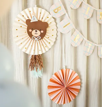 Schattige decoratieve rozetten met berenmotief in een vrolijke mix van kleuren. Na montage hebben de rozetten een diameter van ca. 30 en 35 cm. Perfect om elke kinderkamer, babyshower of feestje op te fleuren met een speelse en gezellige uitstraling!