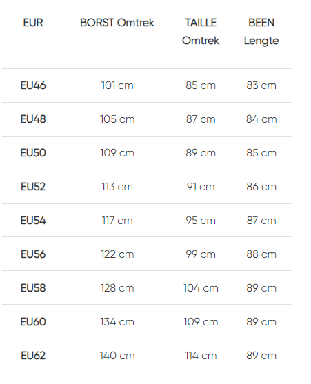 - Beschikbare maten 46 t/m 62 (zie afbeelding voor extra maatinformatie)