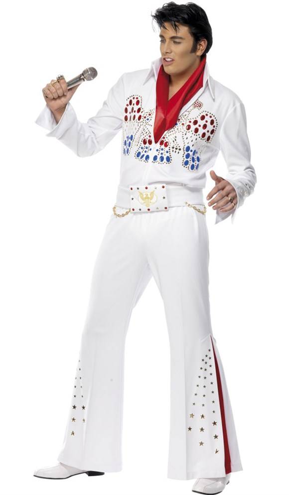 -Elvis American Eagle kostuum bestaande uit de witte jumpsuit, bewerkt met de gekleurde steentjes en gouden sterren, de riem en de rode sjaal.-Beschikbaar in maat MMaat MBorst 97- 102cmMiddel 81- 86cm