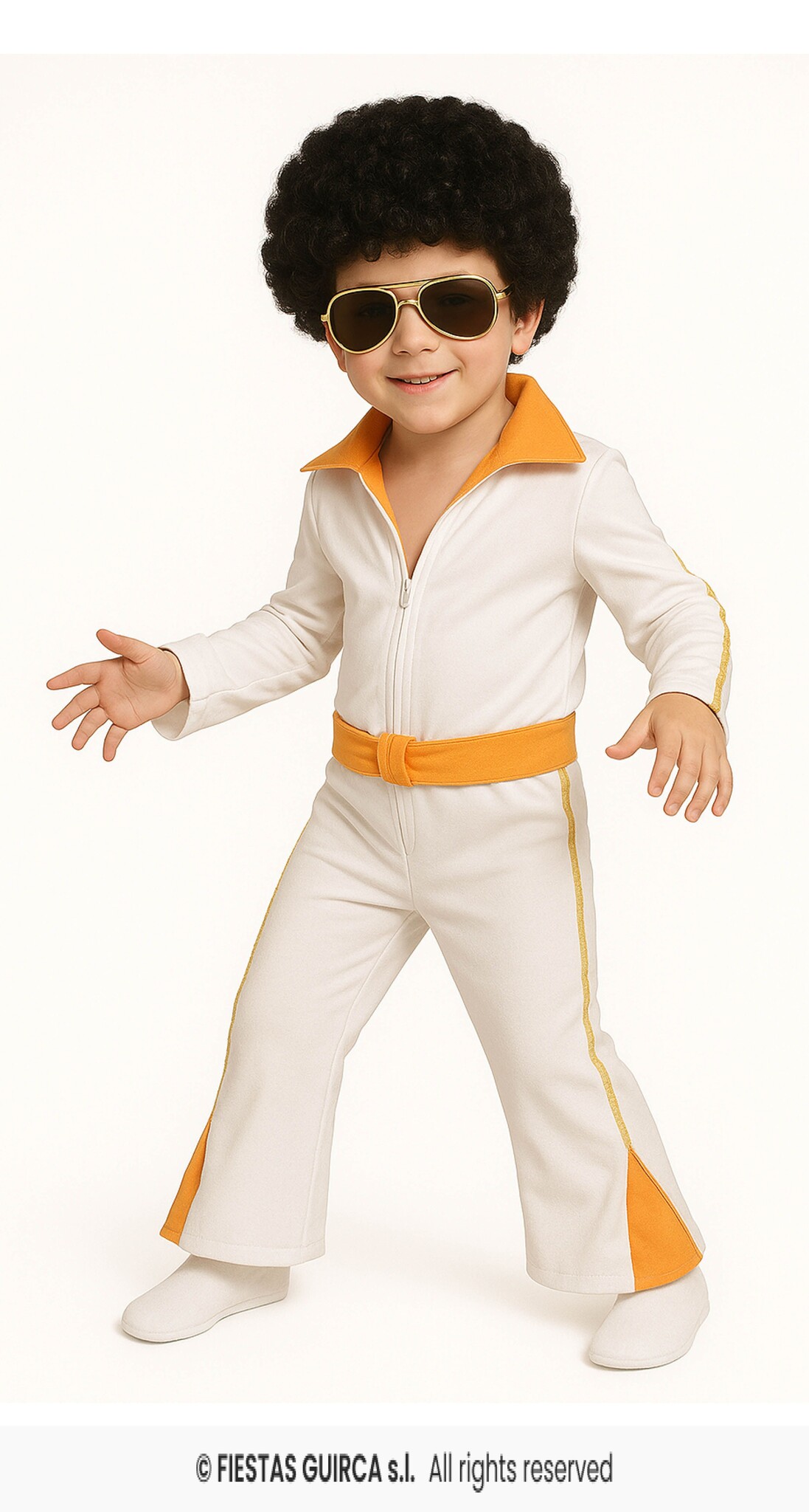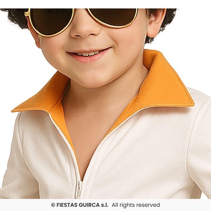 - Elvis Kostuum Kind Goud/wit- Bestaande uit: Jumpsuit en riem- Beschikbare maten: 5-6, 7-9 en 10-12 jaar- Materiaal: Polyester- Exclusief pruik en bril!