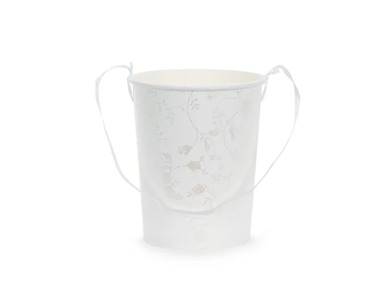 - Emmertje Wit met Bloemenpatroon- Hoogte ± 13 cm; Diameter ± 9-11 cm- Emmer is voorzien van een parelmoeren, glanzende bloemenprint en wordt geleverd met een wit satijnen lint, lengte ± 50 cm