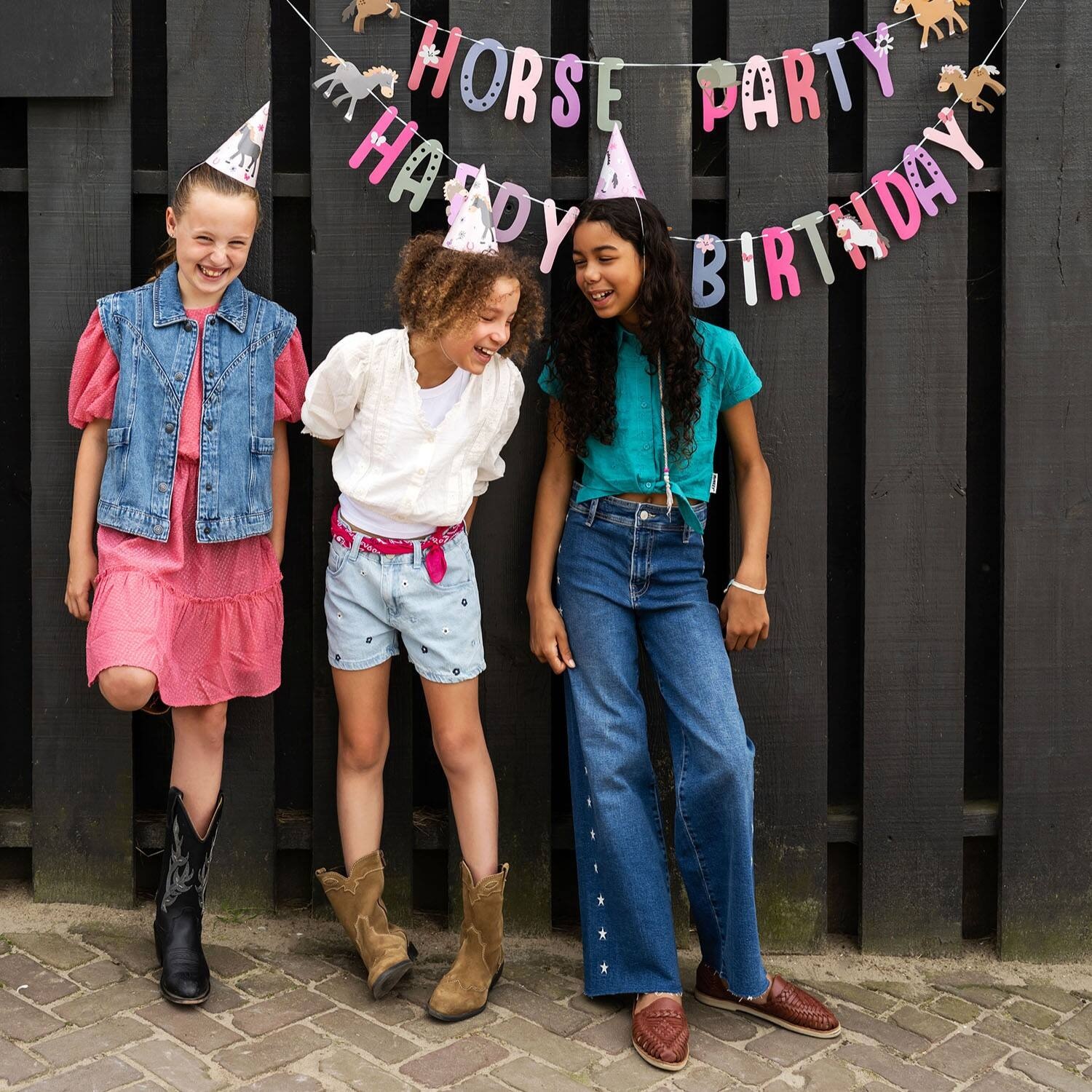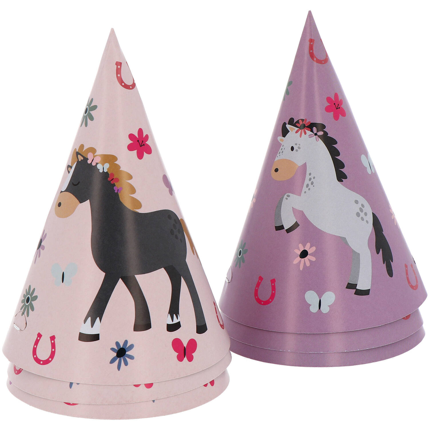 Ook de paardjes vieren feest! Feesthoedjes - Happy Horses - 6 stuks. Inhoud: 6 feesthoedjes. Bijvoorbeeld te gebruiken tijdens de volgende feestgelegenheid/feestgelegenheden: Kinderfeestje, Verjaardag, Themafeest. Deze vrolijke feesthoedjes zijn 16 cm hoog. Er zijn twee designs: eentje met een wit paardje tegen een lila achtergrond en eentje met een grijs paardje tegen een zachtroze achtergrond. De hoedjes zijn plat verpakt en kunnen gemakkelijk tot hoedje worden gevouwen. Met de elastiekjes blijven de hoedjes goed op het hoofd zitten. Deze feesthoedjes horen bij de Happy Horses collectie van Folat. Dit artikel is gemaakt van papier.