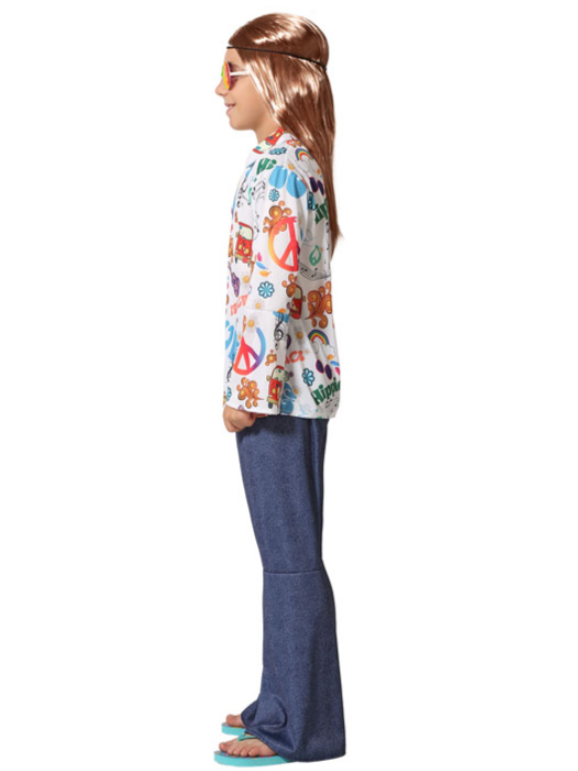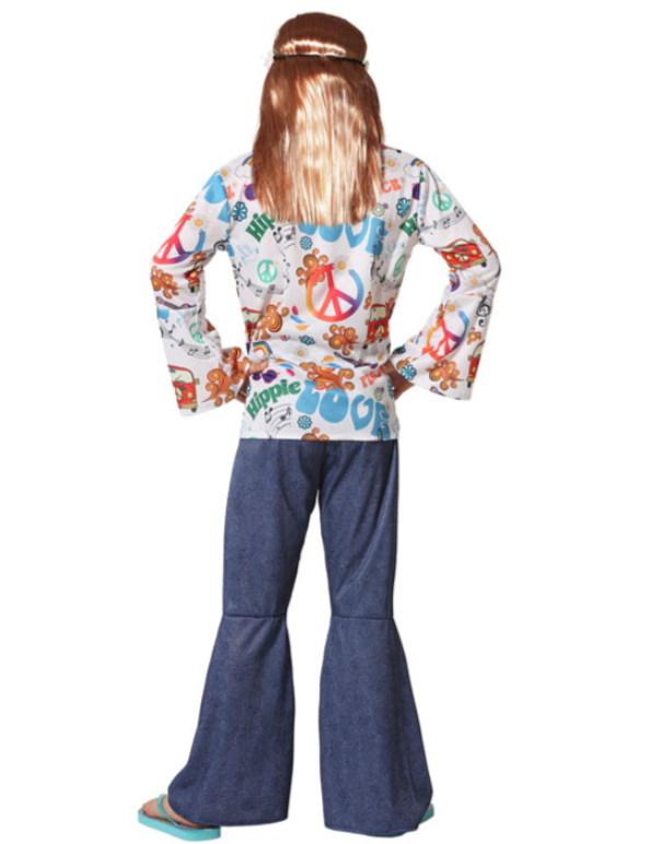 Deze Flower Power outfit voor jongens is perfect voor een retro uitstraling! De lange, blauwe broek met wijde pijpen is niet alleen trendy, maar zorgt ook voor een comfortabel gevoel. De stralende, witte blouse met kleurrijke hippie-tekens voegt een speelse en vrolijke touch toe, waardoor je echt opvalt in de menigte. Combineer het geheel met vrolijke accessoires, zoals een peace-teken ketting of kleurrijke armbanden, en je bent helemaal klaar om de spirit van de jaren '60 en '70 te omarmen!