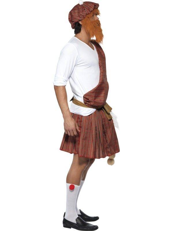 -Inclusief muts met haar en baard, shirt, sjerp, kilt, sokken en riem met penis.
