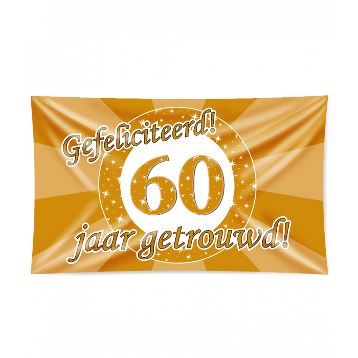 - XXL Gevelvlag 60 Jaar Getrouwd- Materiaal: Polyester - Afmetingen: 150 x 90cm- Geschikt voor gebruik binnen en buitenDe gevelvlag heeft aan elke hoek twee touwtjes van ongeveer 14 cm lang om ergens aan vast te knopen.