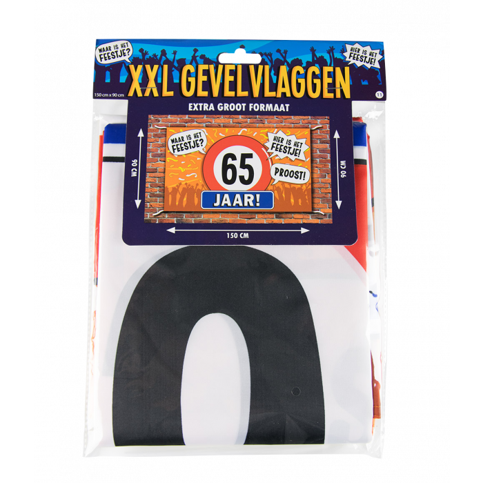 - Gevelvlag 65 Jaar - Bestaat uit 1 Gevelvlag - Afmeting: 90 x 150cm- Materiaal: Polyester- Geschikt voor gebruik binnen en buitenDe gevelvlag heeft aan elke hoek twee touwtjes van ongeveer 14 cm lang om ergens aan vast te knopen.