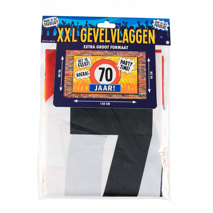 - Gevelvlag 70 jaar - Inhoud: 1 gevelvlag- Afmeting: 90 x 150 cm- Materiaal: Polyester- Geschikt voor gebruik binnen en buitenDe gevelvlag heeft aan elke hoek twee touwtjes van ongeveer 14 cm lang om ergens aan vast te knopen.