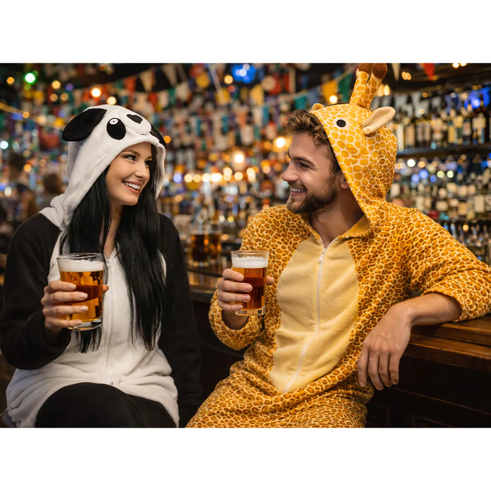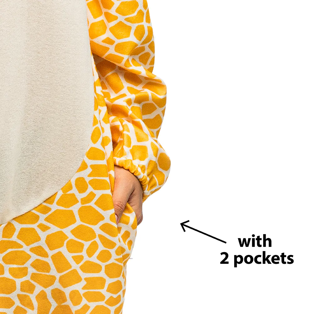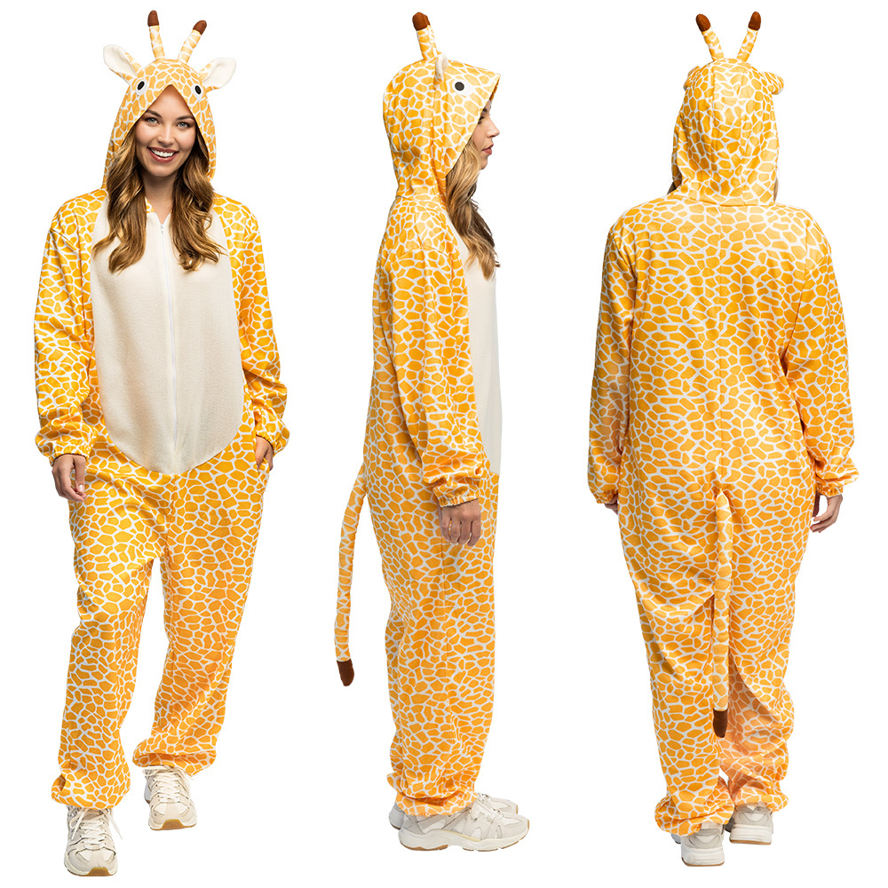 Met deze giraffe onesie steel je meteen de show. De warme geel-oranje giraffeprint, het schattige staartje, de zachte stof en natuurlijk de capuchon met oortjes en hoorntjes maken dit een super herkenbaar en vrolijk dierenkostuum. Dit unisex kostuum is perfect als matching duo of groepsoutfit en is geschikt voor mannen en vrouwen. Het giraffepak heeft handige zakken waarin kleine spullen zoals sleutels of een telefoon in opgeborgen kan worden. Daarnaast kan het kostuum gemakkelijk over de eigen kleding gedragen worden door de comfortabele, ruime pasvorm. Een echte aanrader dus voor carnaval, themafeesten, foute feesten of om gezellig te loungen op de bank.
