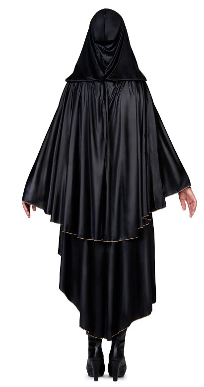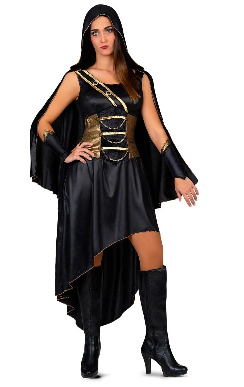 - Golden Hunter Dames Kostuum- Bestaande uit: Jurk met cape en capuchon en polsbanden- Beschikbare maten: S en M/L- Materiaal: 100% polyester
