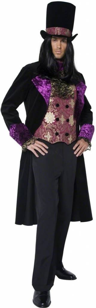 -Bestaande uit: gilet met hieraan vast de das, lange jas met paarse voering, hoge hoed.