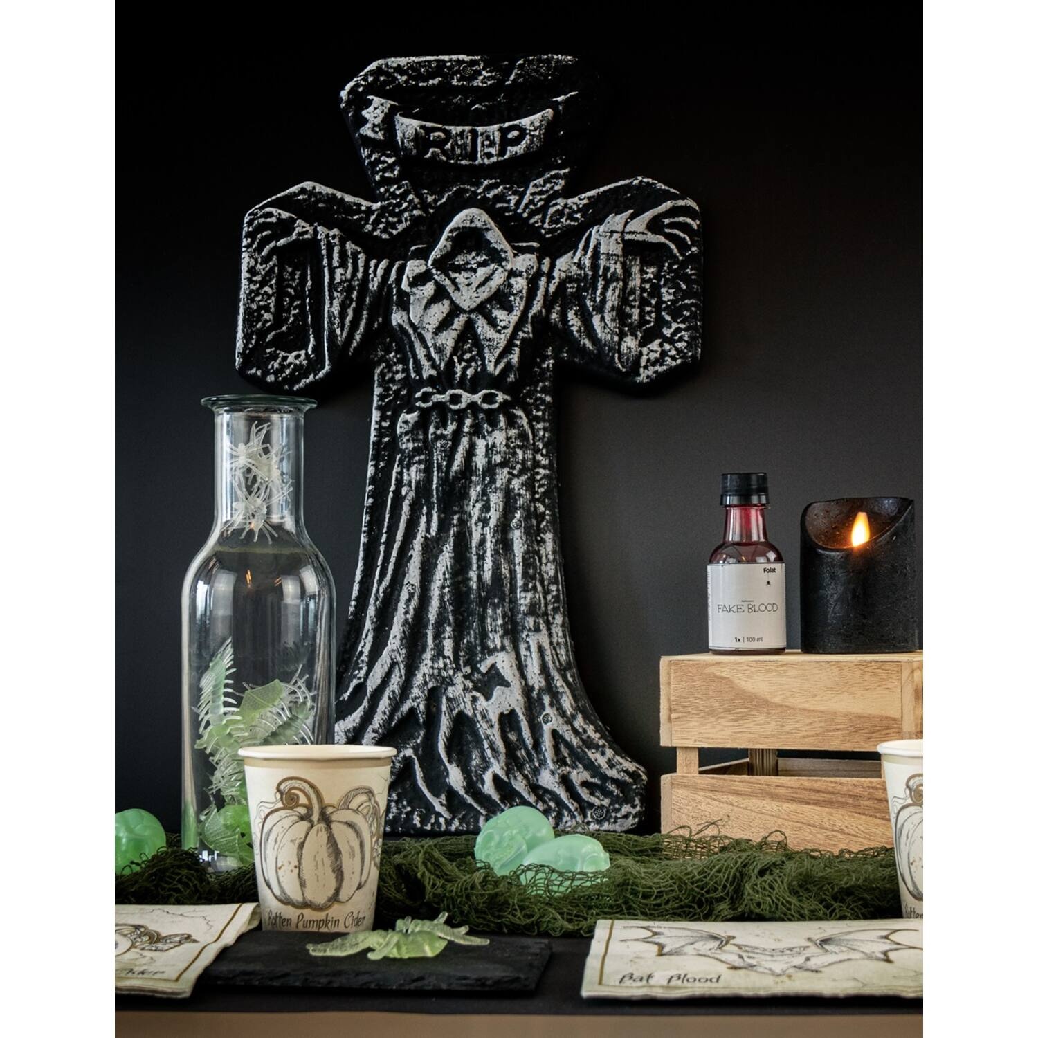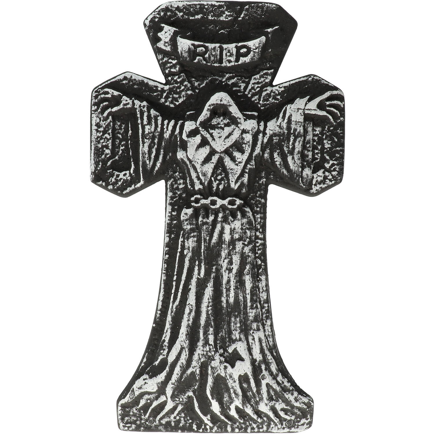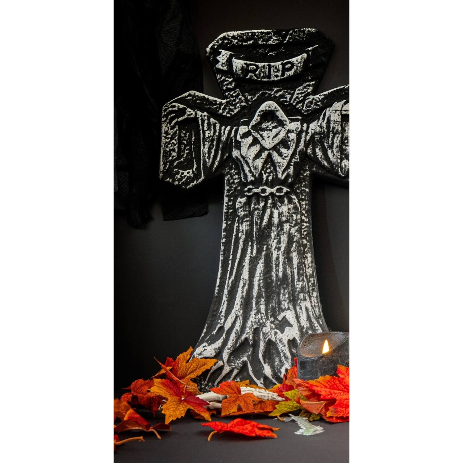 Geen rust op dit feest! Grafsteen in de vorm van een kruis met een verweerde look. Voor spookachtige feesten waar er zeker geen rust zal heersen. Dit artikel is gemaakt van foam.
