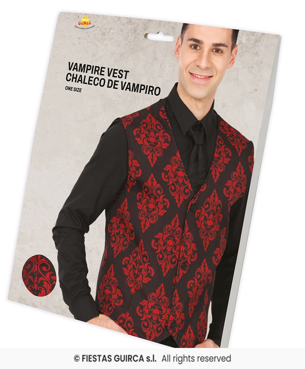 Dompel jezelf onder in de mysterieuze sfeer van Halloween met ons stijlvolle Halloween Gilet Vampier voor Heren! Dit stoere gilet, uitgevoerd in diep zwart en rijk bordeauxrood, voegt een vleugje elegantie toe aan je vampier kostuum. Perfect voor feesten, Halloween evenementen of een griezelige avond thuis. Combineer het gilet met een zwarte overhemd en bijvoorbeeld een vleermuizen cape voor de ultieme vampierlook. Maak van deze Halloween een onvergetelijke ervaring met dit veelzijdige en modieuze kledingstuk!