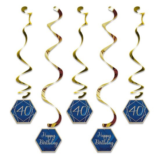 - Hangdecoratie Swirls 40 jaar Navy Blauw/ Goud (5st)- Aantal: 5 stuks per verpakking- Lengte: ± 1 meter- Materiaal: Folie- Dubbelzijdig bedrukt