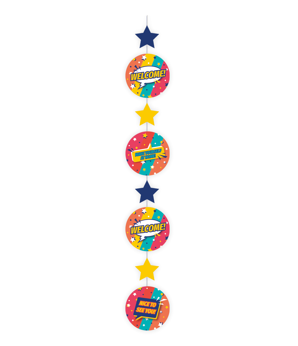- Hangdecoratie Welcome Cartoon- Aantal: 1 stuk per verpakking- Afmetingen: 120 cm lang en een diameter van 15 cm - Materiaal: karton met gladde afwerking