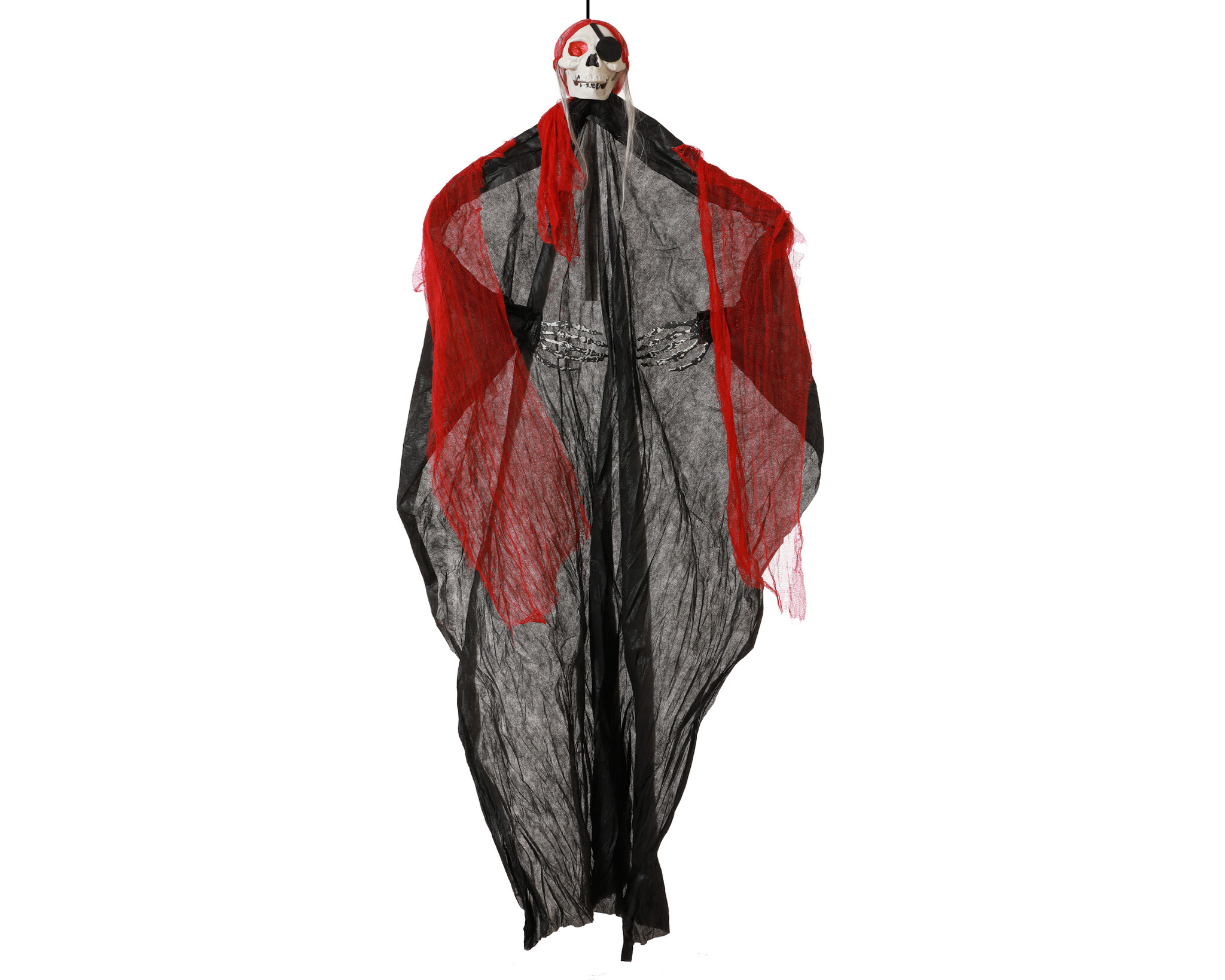 Vier Halloween met deze indrukwekkende Hangende Piraten Skelet van maar liefst 210 cm! Dit angstaanjagende decorstuk is perfect om elke ruimte om te toveren in een ware spookachtige piratenhaven. Gekleed in een groot rood en zwart doek, straalt het skelet een mysterieuze en avontuurlijke sfeer uit. Hang het boven de deur of aan het plafond voor een schokkende verrassing voor je gasten. Met zijn enge details en sinistere uitstraling is dit piratenskelet de ideale aanvulling op je Halloween decoratie. Zorg ervoor dat je je vrienden en familie onderweg de stuipen op het lijf jaagt met dit indrukwekkende stuk!