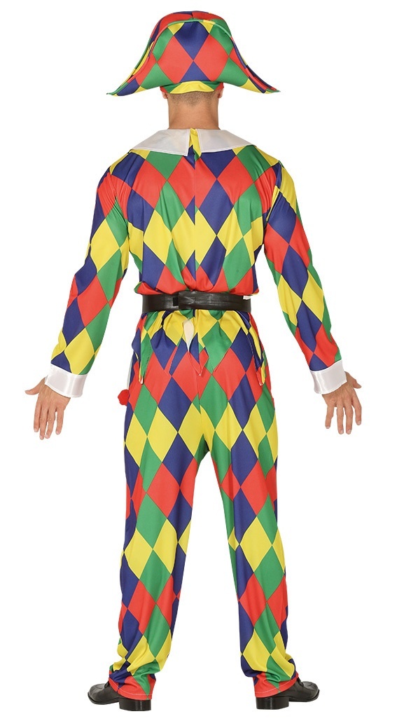 - Harlekijn verkleedpak Heren- Bestaande uit: Shirt, broek, riem en hoed- Beschikbare maten: M en L- Materiaal: 100% Polyester