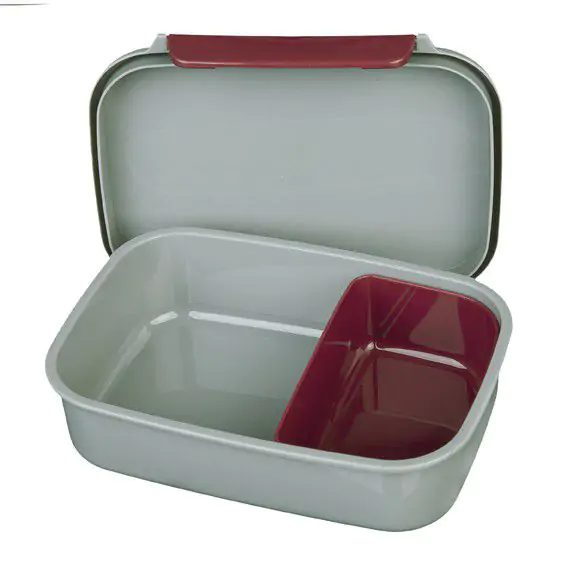 Deze lunchbox bevat ook een verdeling aan de binnenkant, zodat je alles apart kan bewaren in de trommel.