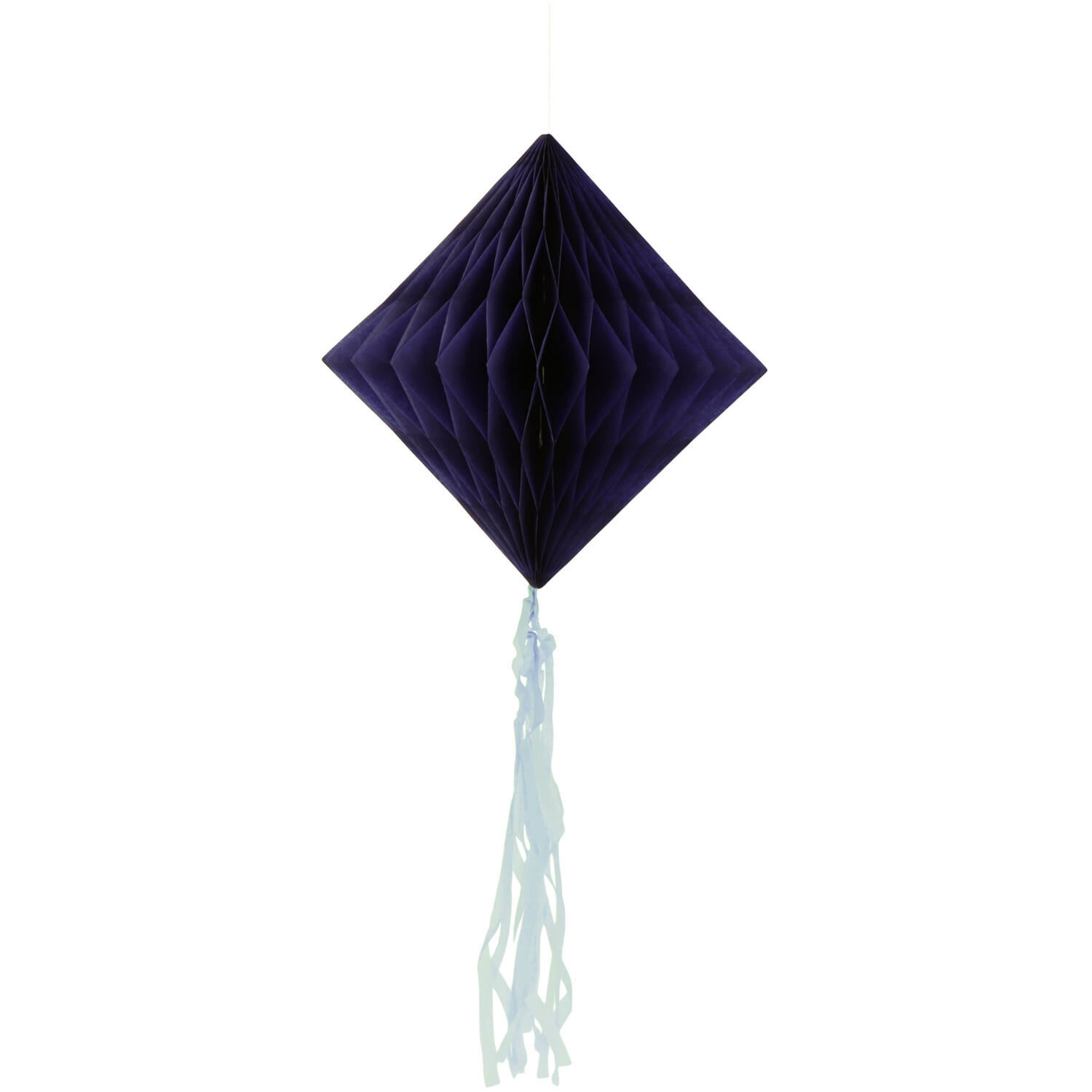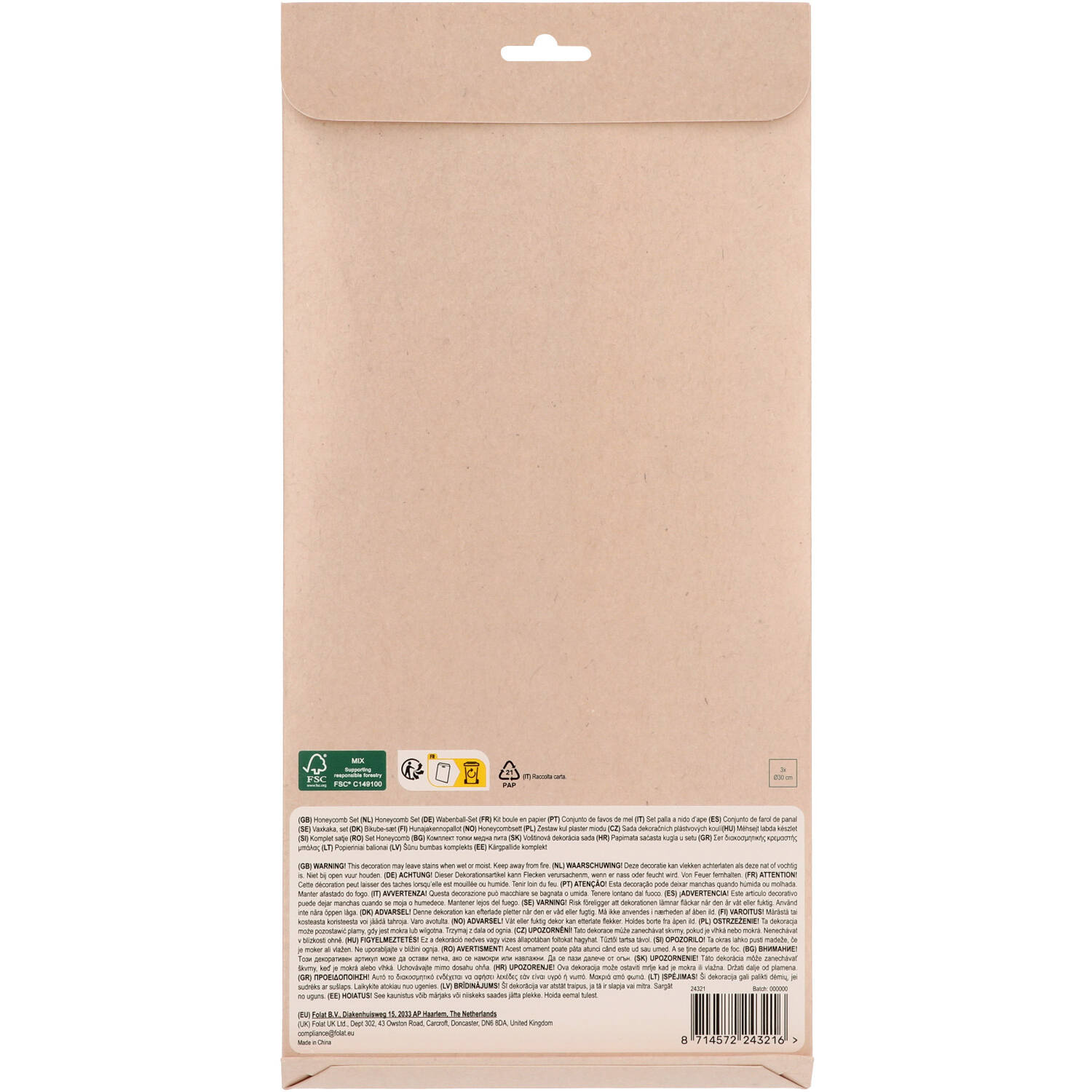 Een zwierige klassieker in krachtig blauw. Mooie, stevige honeycombs in drie tinten blauw. In de vormen: ruit, rond (met 30 cm diameter) en ovaal (25 x 30 cm groot). Aan elke honeycomb hangt een 25 cm lang kwastje van papier in een contrasterende blauwe tint. De honeycombs zijn opgevouwen verpakt en kunnen voor gebruik gemakkelijk worden uitgevouwen. De decoratie kan gemakkelijk opgehangen worden aan het katoenen touwtje. Met paperclips om de waaiers in ronde vorm te houden. Dit artikel is gemaakt van FSC papier.