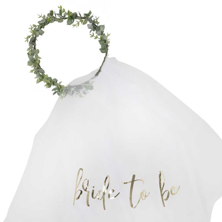 - Hoofdband 'Bride To Be' Sluier Eucalyptus- Voorzien van nep eucalyptus bladeren- Afmetingen: Breedte sluier 63,5 cm, Lengte hoofdband + sluier 70cm