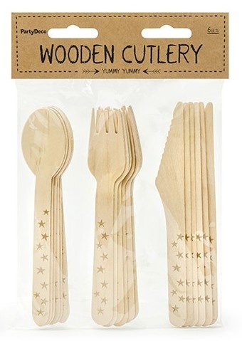 - Houten Bestek Woodland Sterren Goud (18st)- Bestaande uit: 6x Mesjes, 6x Vorkjes en 6 lepels- Afmetingen: 16cm- Materiaal: Hout