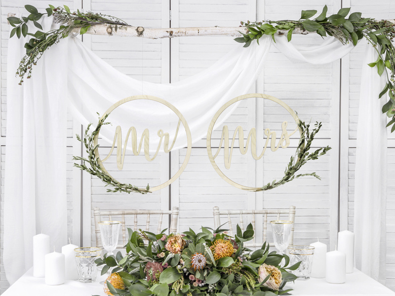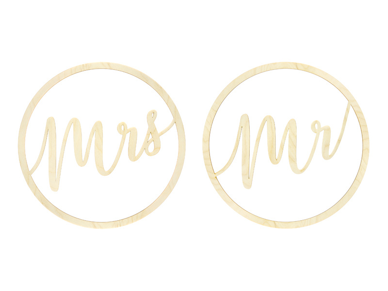 -2 houten cirkels met in de ene de letters 'Mr' en in de andere 'Mrs'