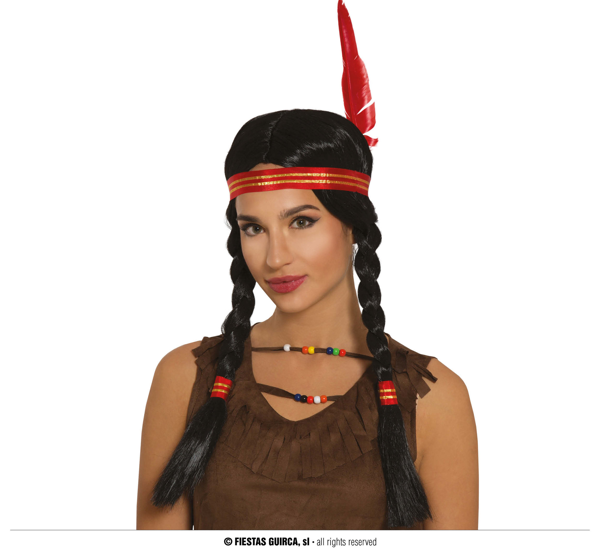 - Indiaanse pruik met vlechtjes en hoofdband + veer