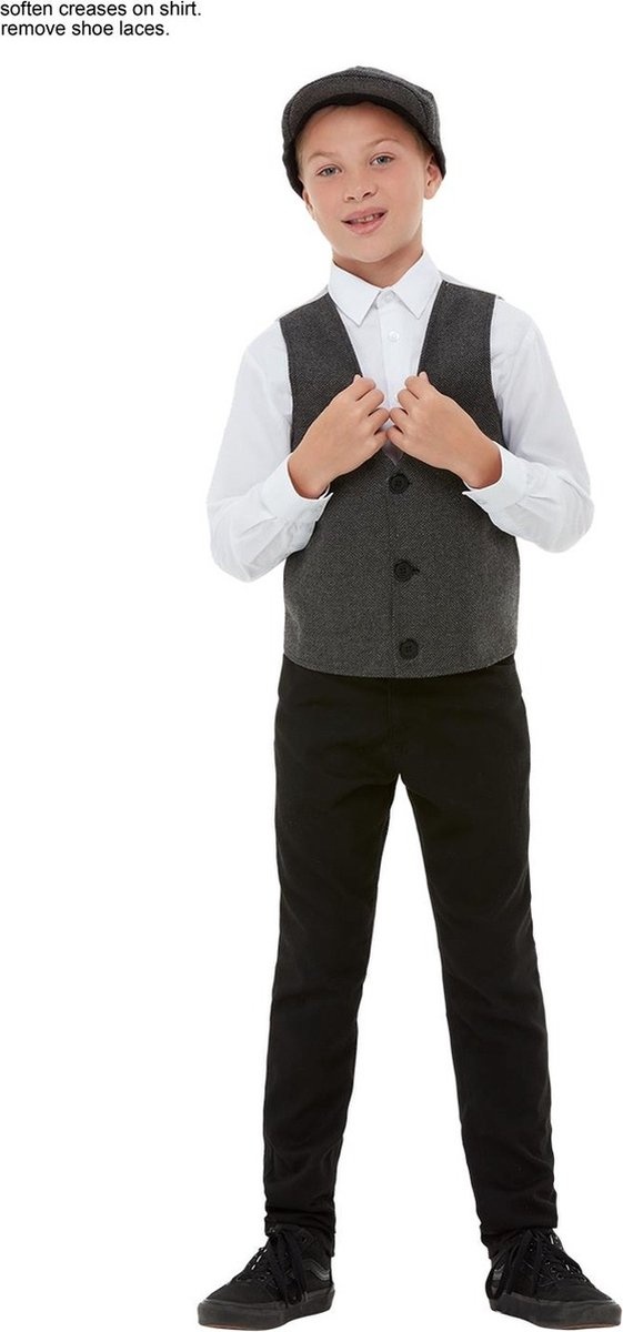 - 20's Peaky Blinders Set 2-delig Kind Murphy- Bestaande uit: Pet & Gillet (exclusief blouse!)- Beschikbare maten: one size- Leeftijd 5-8 jaar; Lengte Gilet ± 45 cm lang en maximaal 66 cm rond de taille
