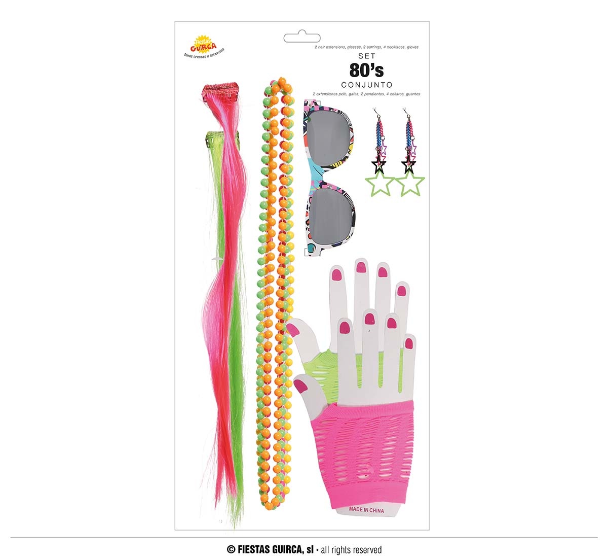 - Jaren 80 Accessoire set Joyce- Bestaande uit: 2 hairextensions, 1 bril, 2 oorbellen, 4 kettingen, 2 handschoenen