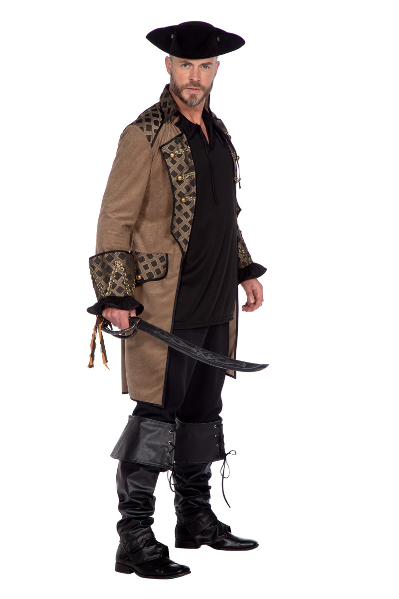 - Jas Piraat Taupe Luxe- Beschikbare maten: S, M, L, XL, XXL- Bestaande uit: Jas- Materiaal: 100% Polyester- Details: op de kraag, schouders, zakken en mouwen zit een geruite stof. De mouwen en kraag zijn afgewerkt met een ruches.